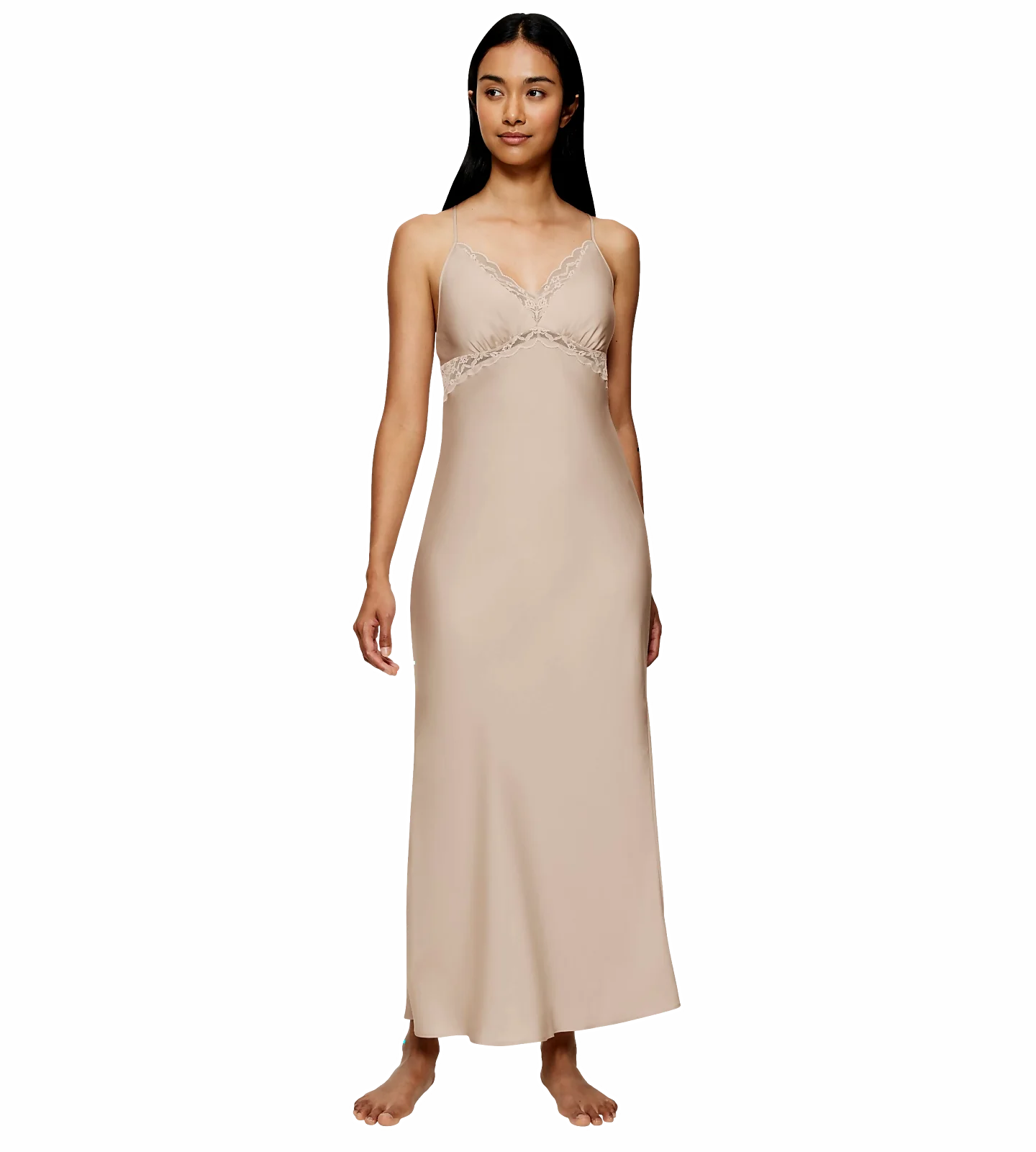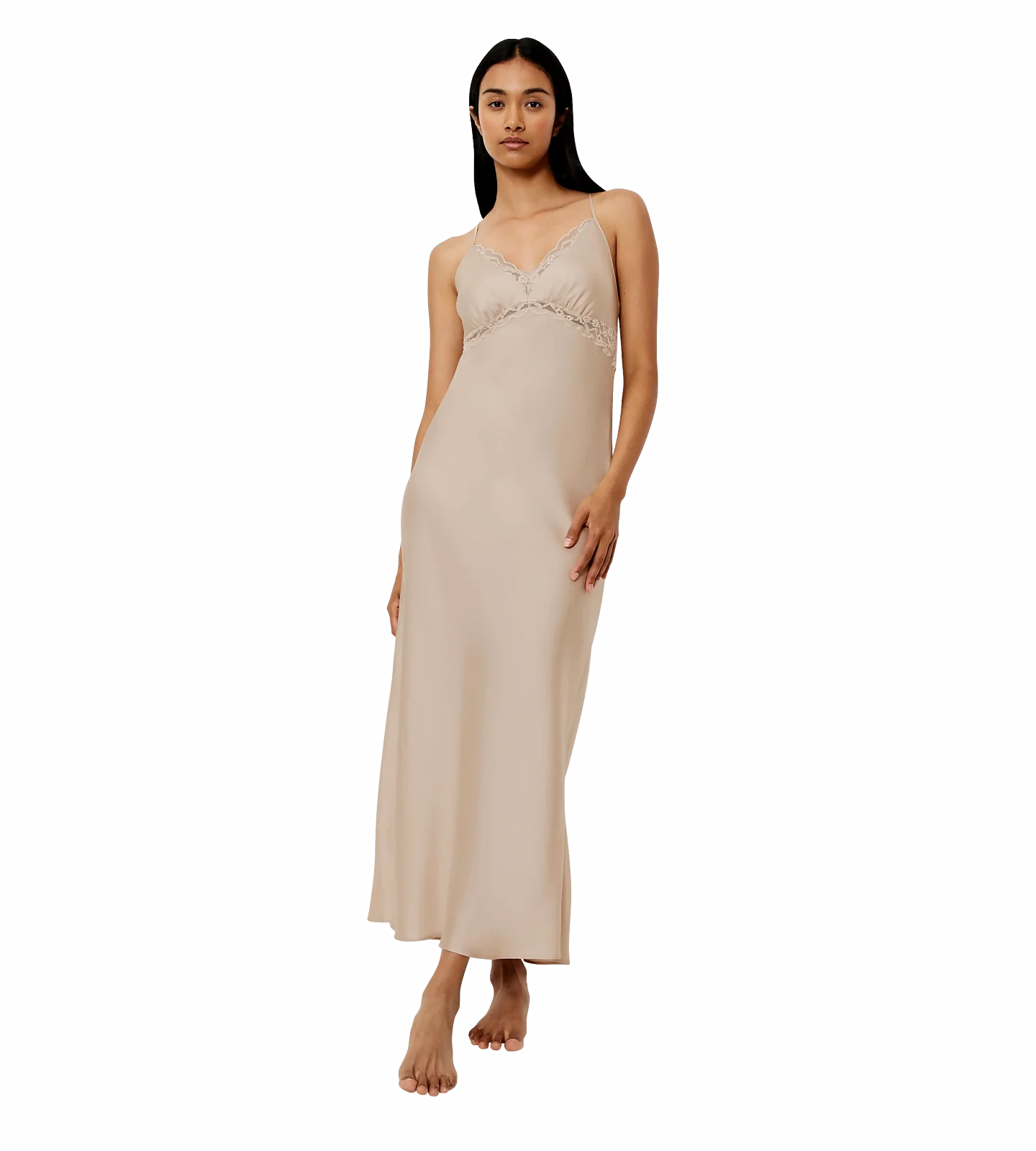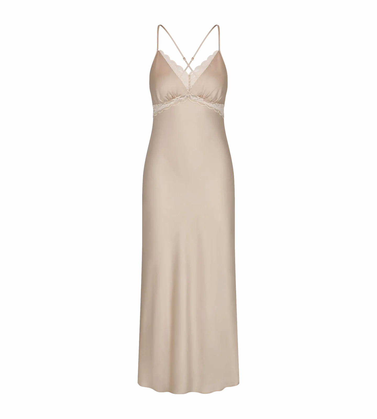 - Krzyżujące się na plecach ramiączka, długość za kolano i wstawki z delikatnej koronki