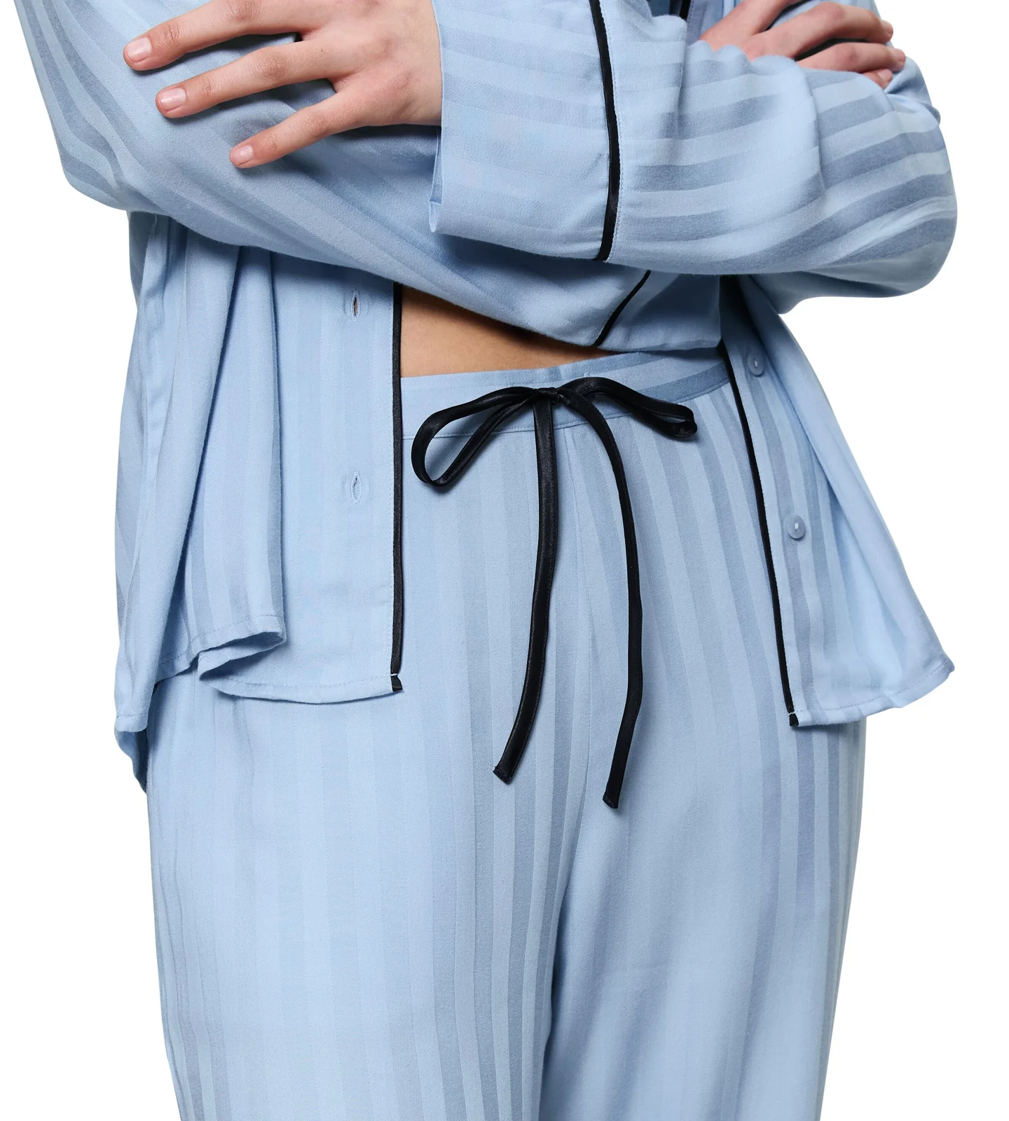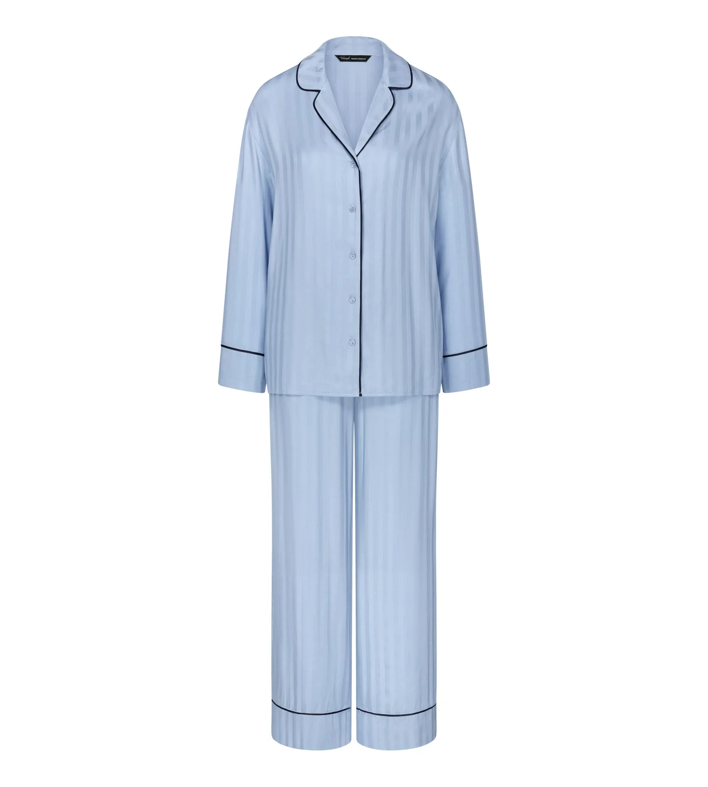 - Klasyczna góra zapinana na guziki w zestawie ze spodniami z szerokimi mankietami dla ponadczasowego wyglądu. Będziesz chciała kłaść się spać wcześniej tylko po to, aby otulić się tą piżamą.