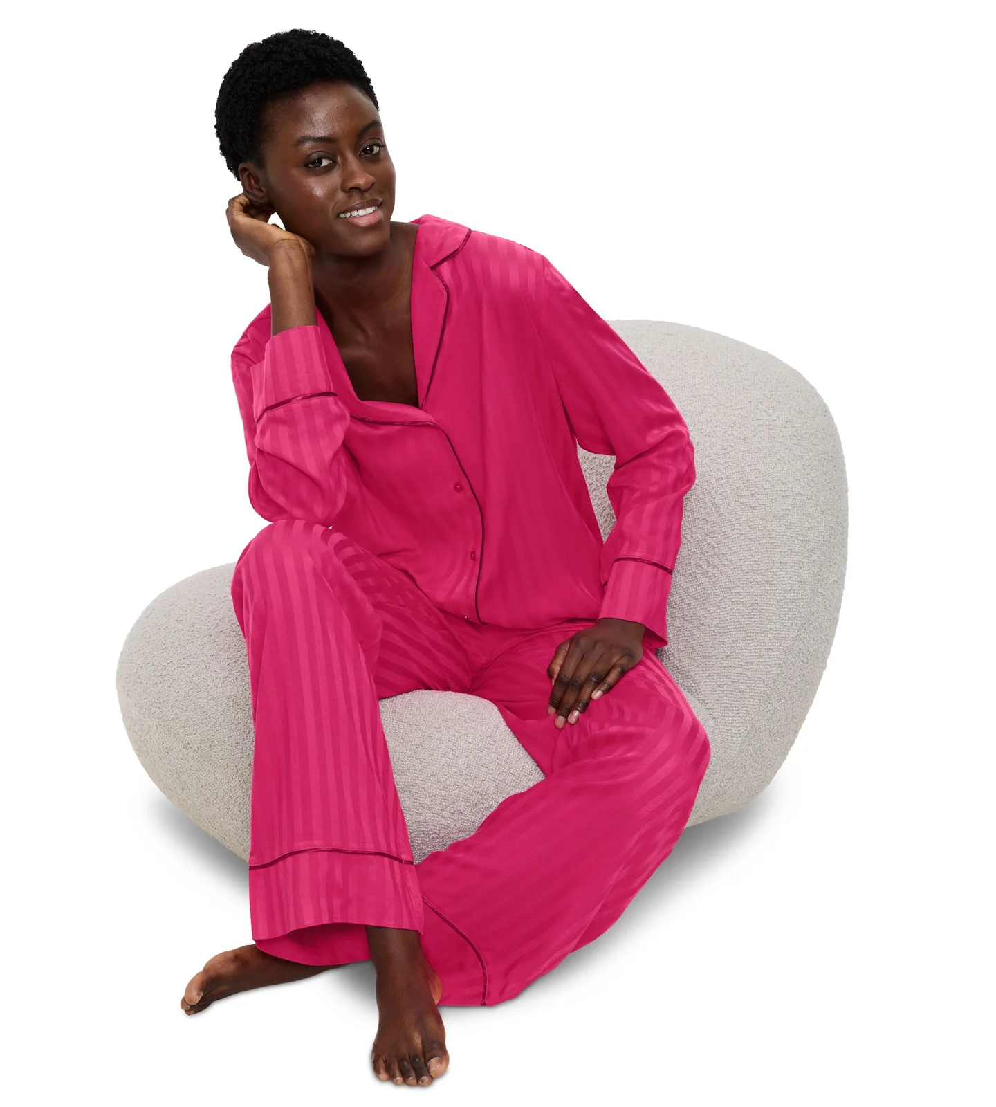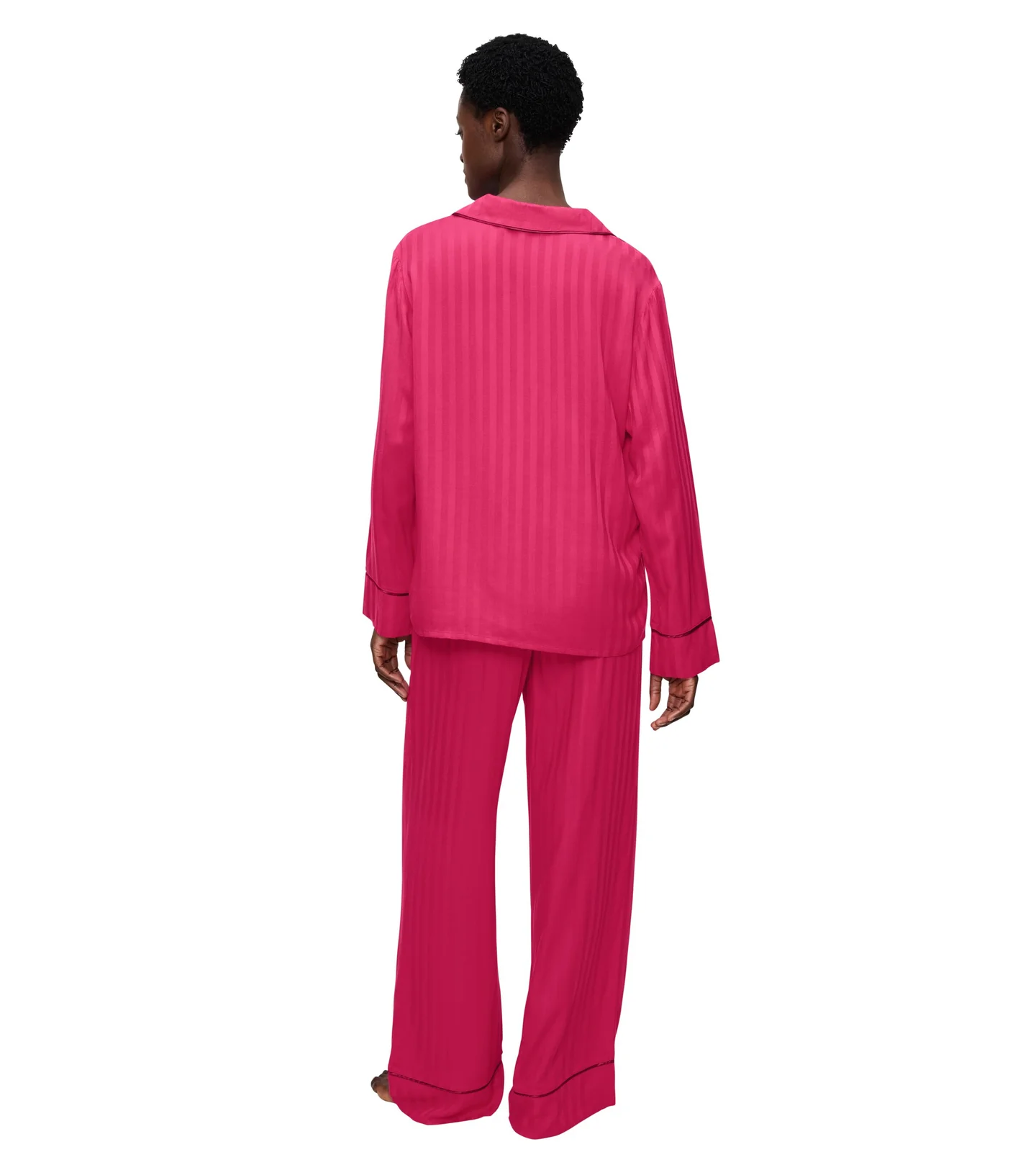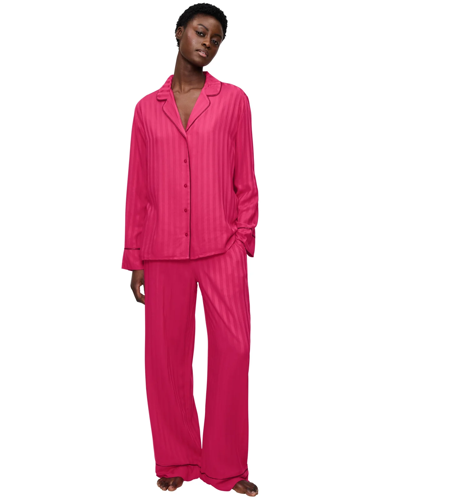 • Klasyczna góra zapinana na guziki w zestawie ze spodniami z szerokimi mankietami dla ponadczasowego wyglądu. Będziesz chciała kłaść się spać wcześniej tylko po to, aby otulić się tą piżamą.