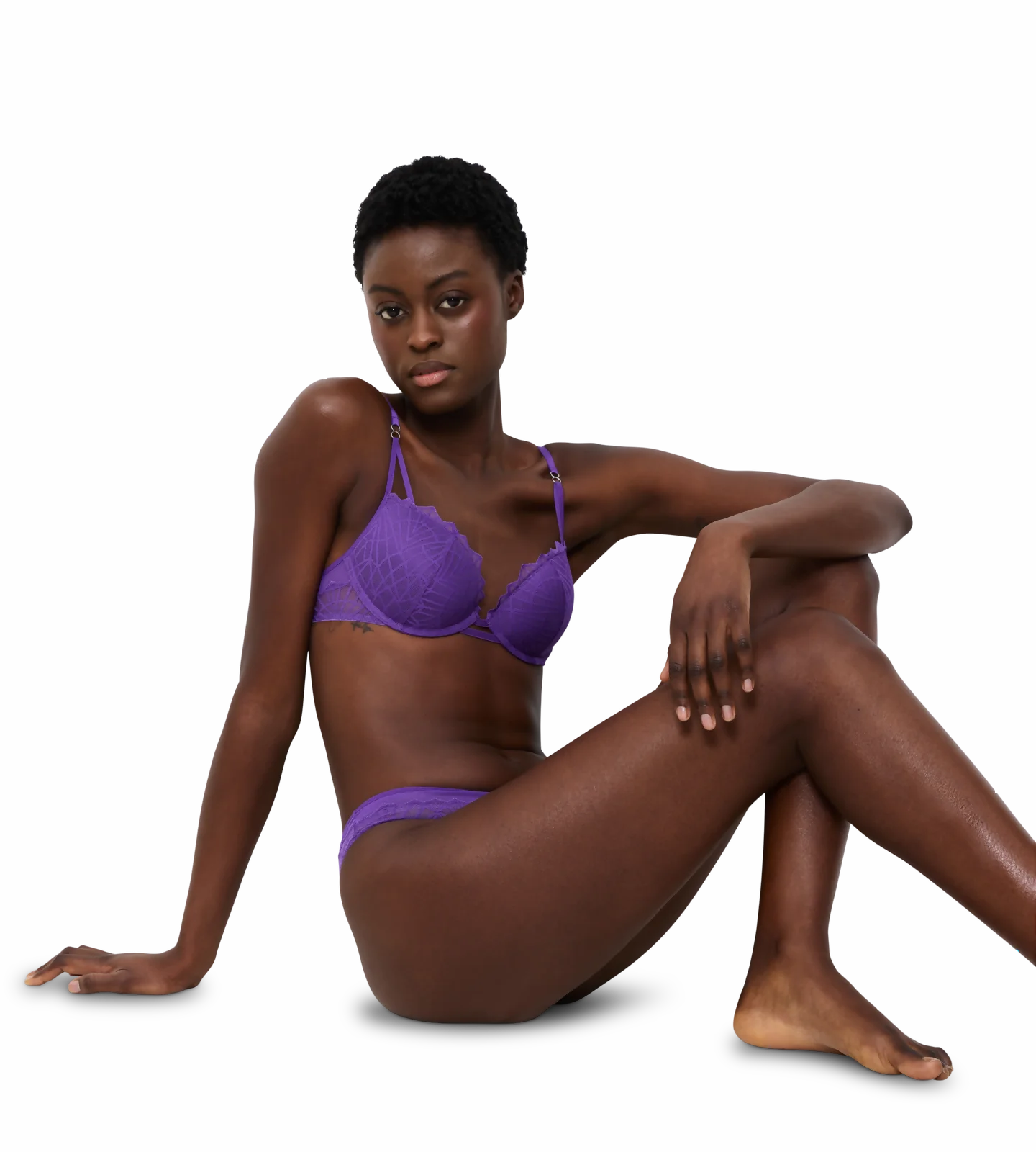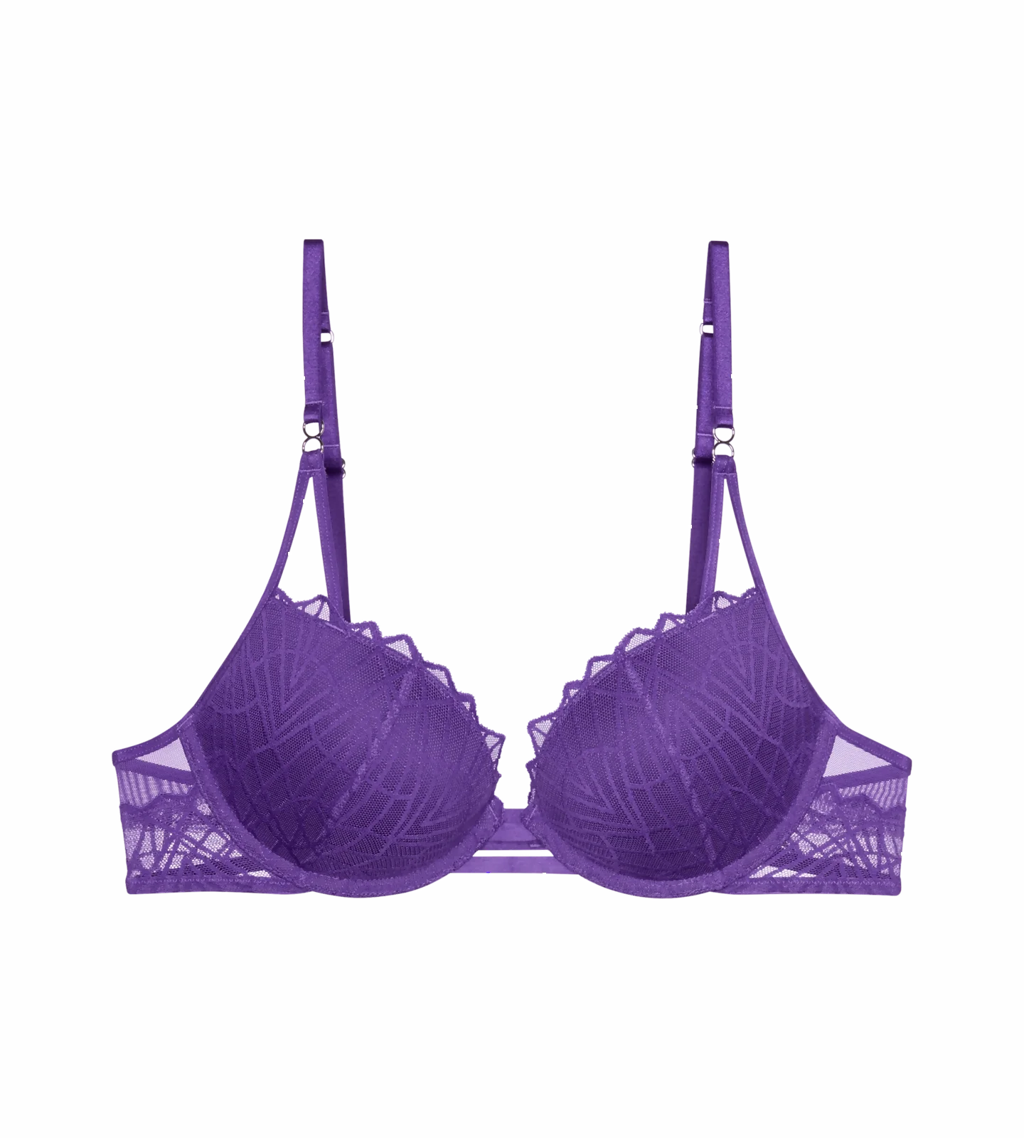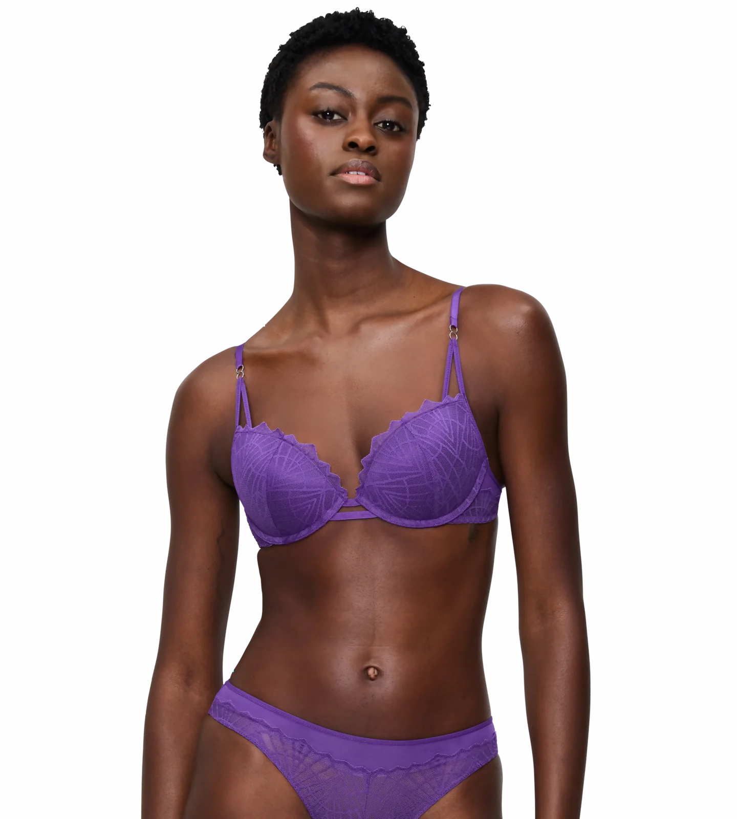 Dekolt w stylu push-up i lekkie miseczki. Biustonosz z graficzną koronką łączy funkcjonalność z atrakcyjnym wyglądem. Z myślą o odważnej i uwodzicielskiej sylwetce.