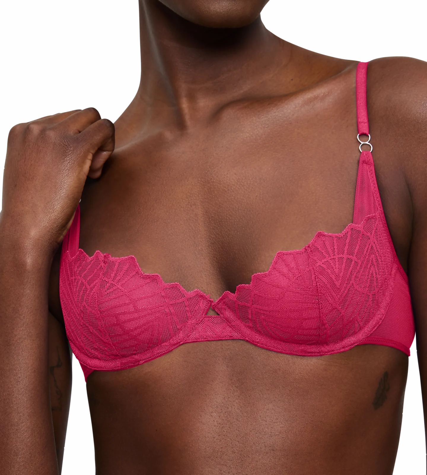Balkonetka dla uwodzicielskiego wyglądu. Koronkowe miseczki i siatkowe wzmocnienia boczne tworzą efekt push-in. Graficzna koronka z przezroczystymi panelami z siateczki dodaje blasku.