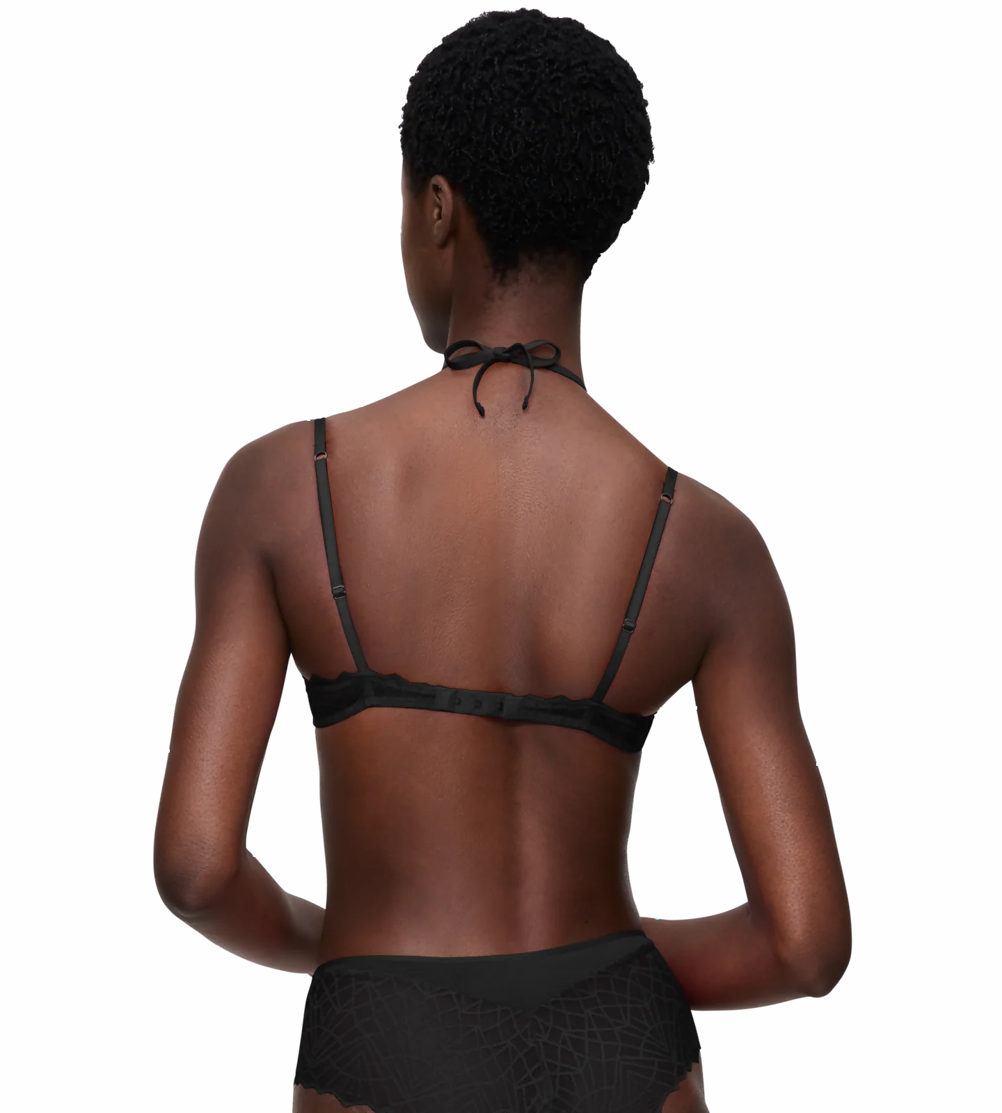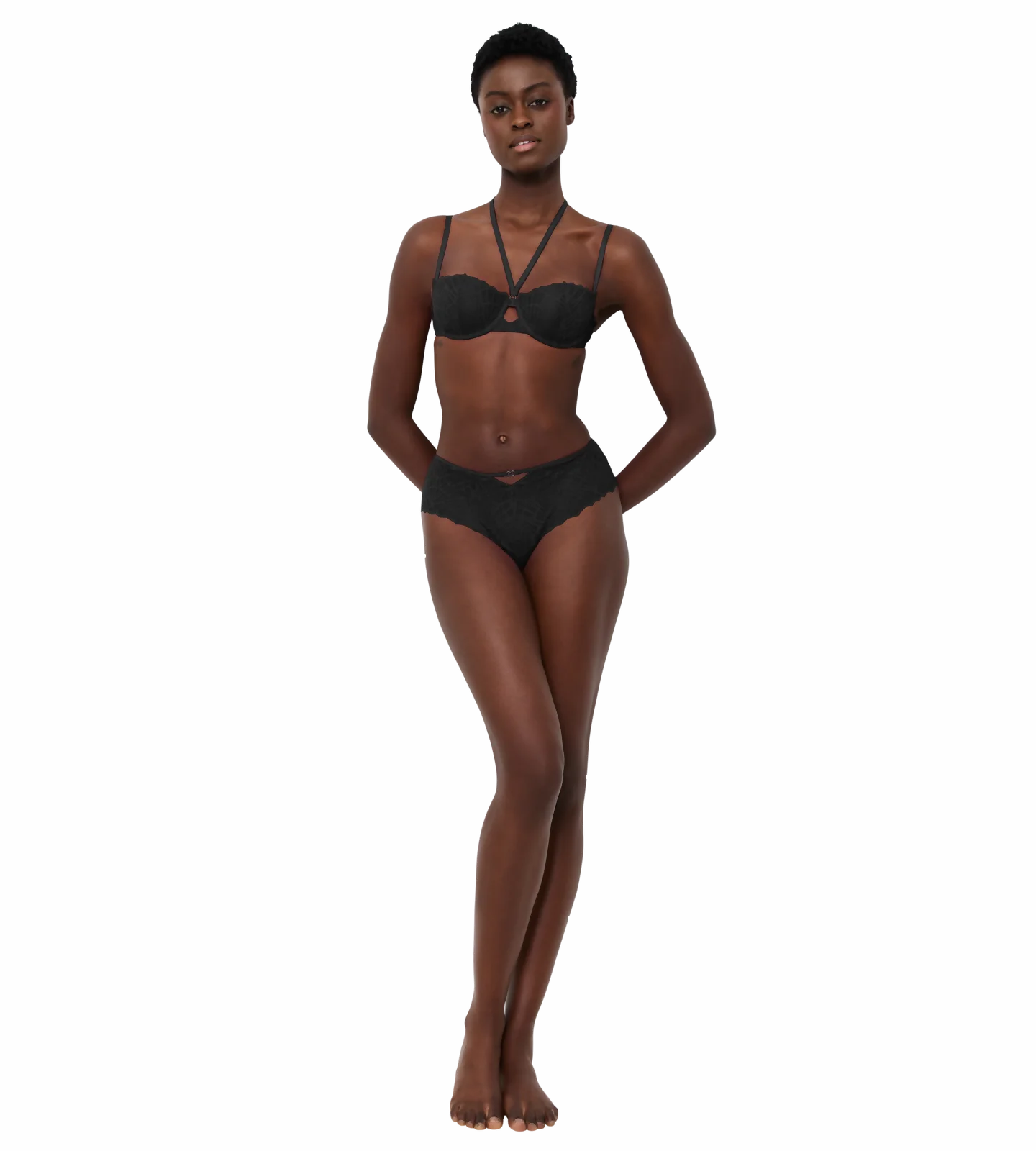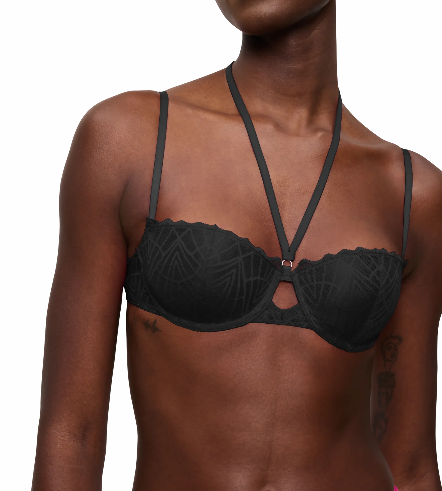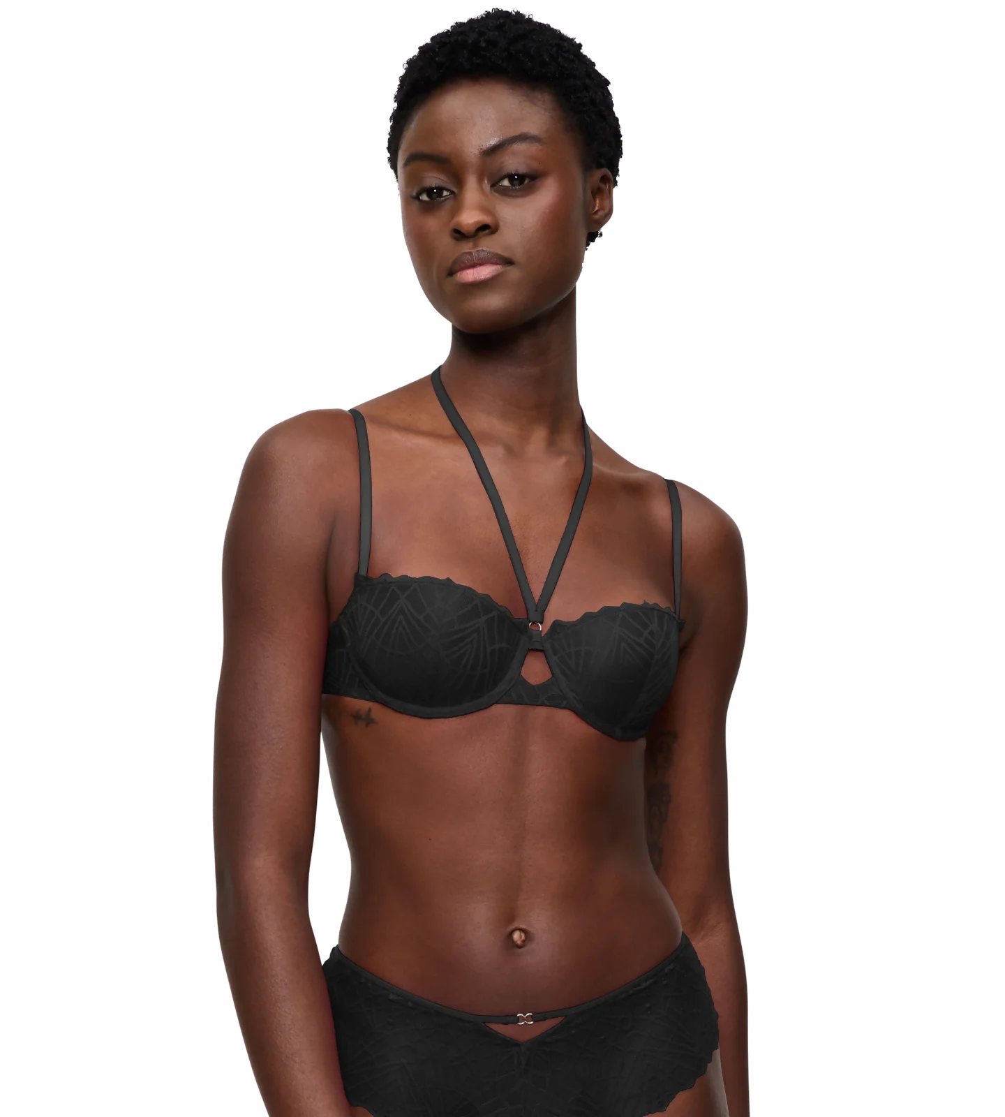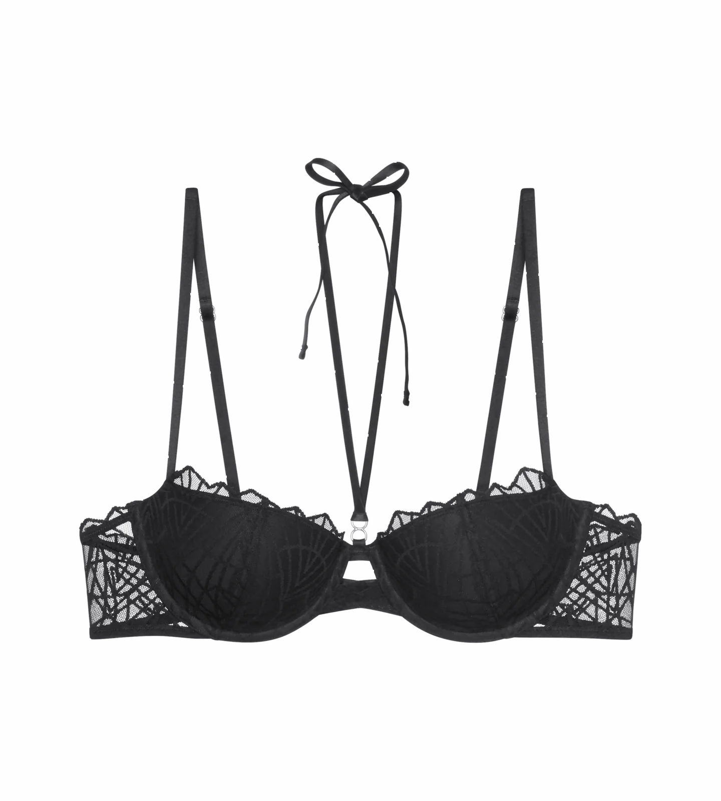 Szykowny, a jednocześnie uwodzicielski. Zaprojektowaliśmy ten biustonosz typu balkonetka z minimalną powierzchnią krycia, aby podkreślić dekolt. Graficzny wzór koronki i ozdobna dziurka pośrodku dodają jeszcze większej elegancji.