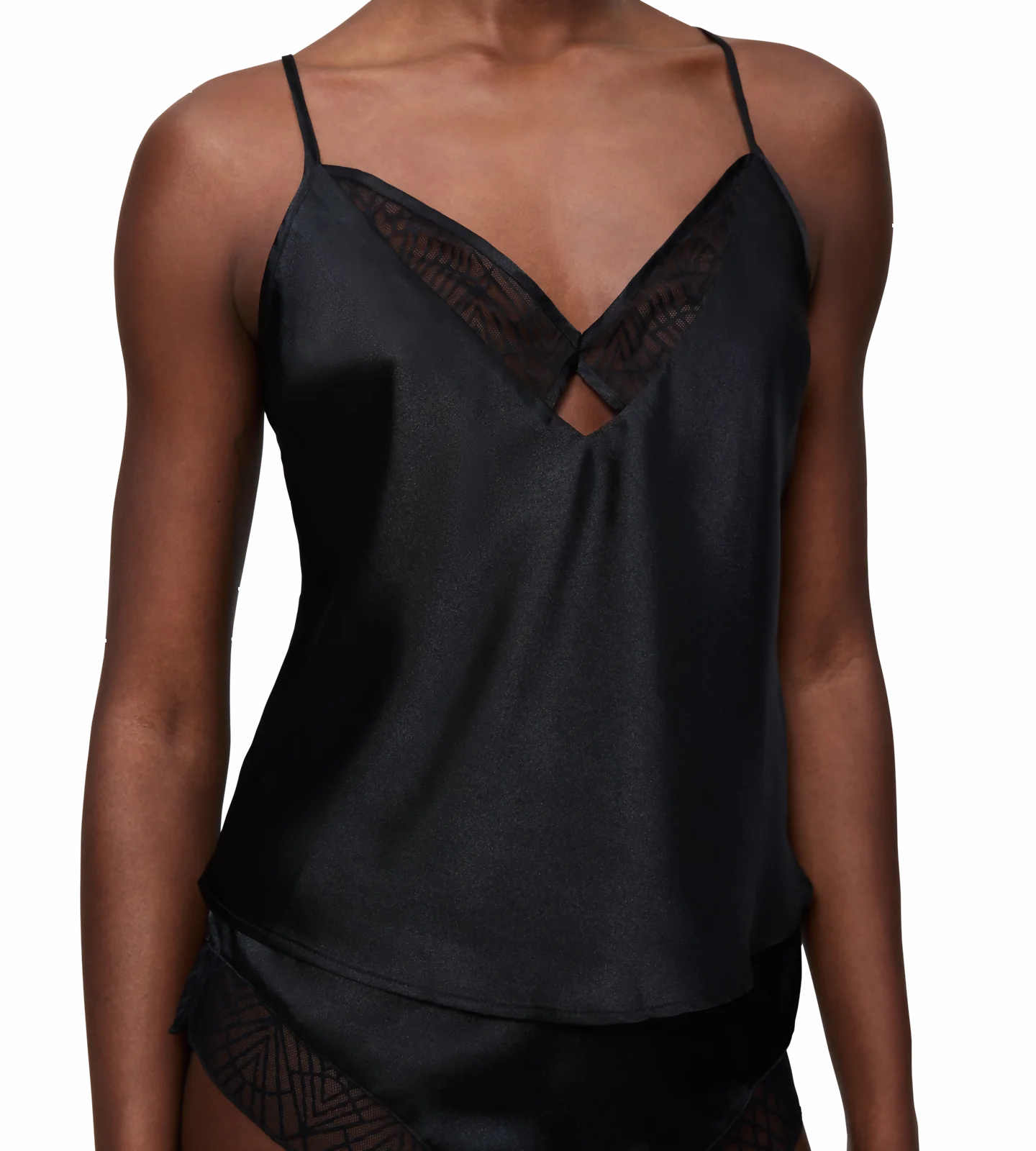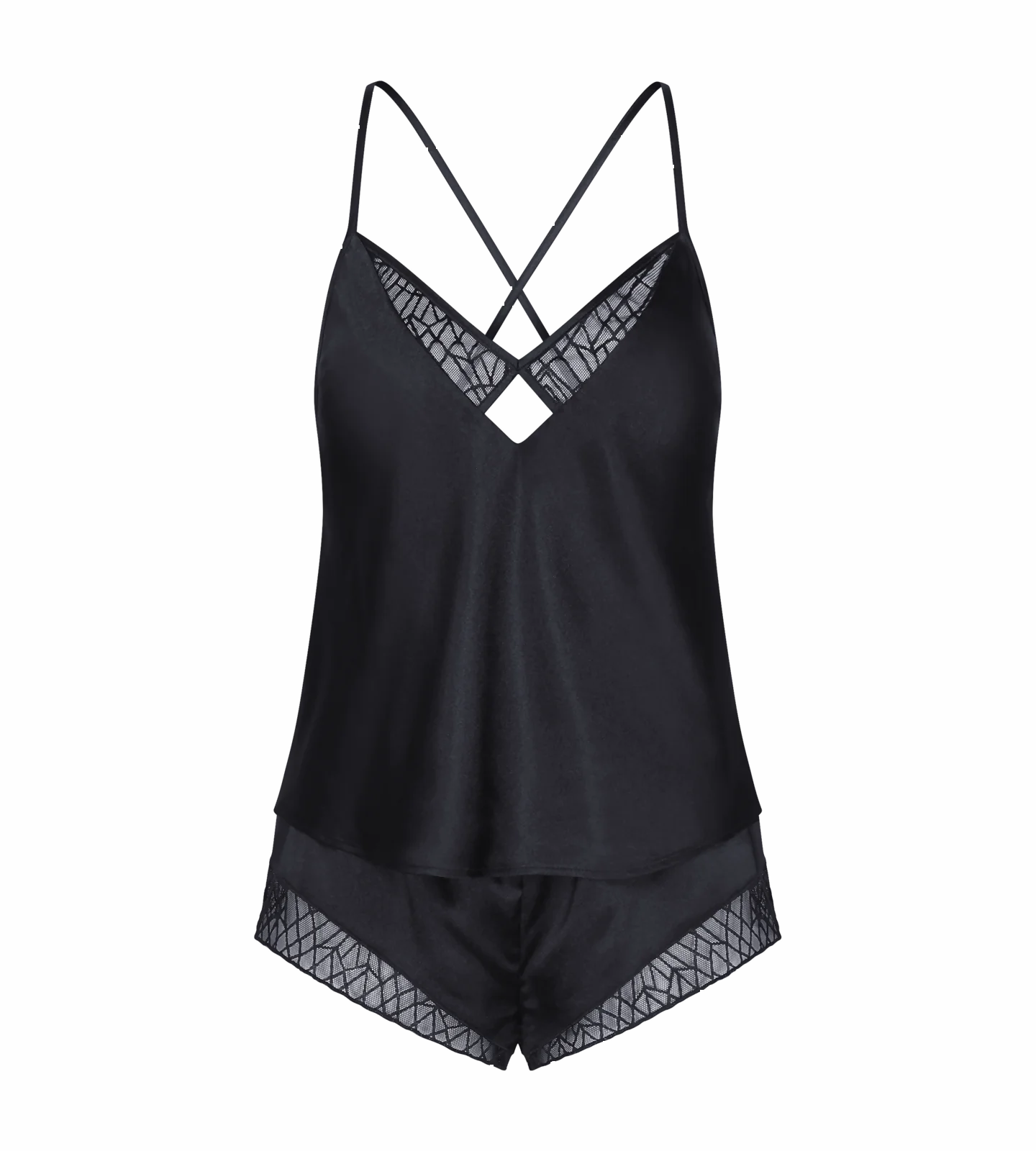 • Zestaw satynowy z koszulką na ramiączkach i szortami łączy lekkość z elegancją. Koronkowe wstawki i głębokie wycięcie na plecach nadają mu zmysłowego charakteru, a miękka satyna gwarantuje komfort noszenia.
