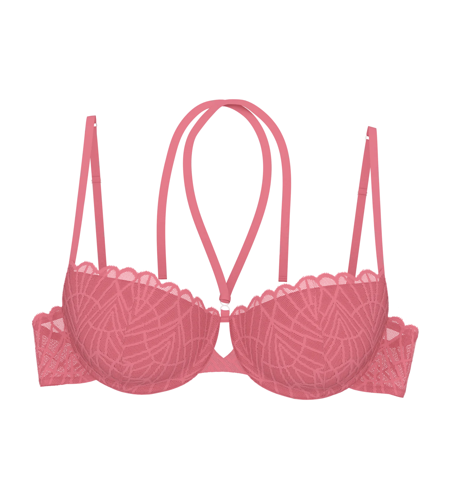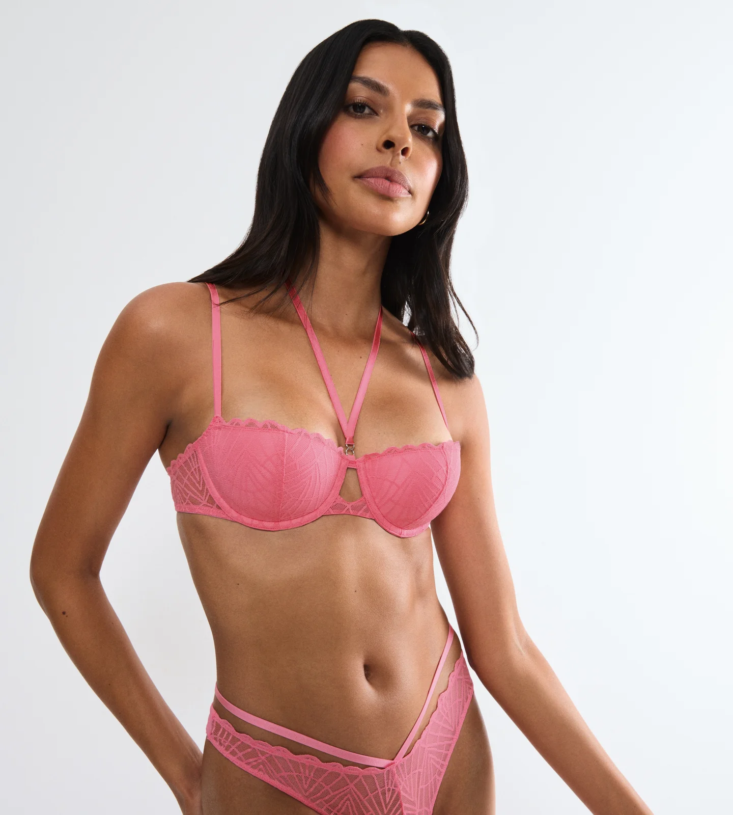 Szykowny, a jednocześnie uwodzicielski. Zaprojektowaliśmy ten biustonosz typu balkonetka z minimalną powierzchnią krycia, aby podkreślić dekolt. Graficzny wzór koronki i ozdobna dziurka pośrodku dodają jeszcze większej elegancji.